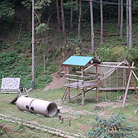●しいのき平 スギ林が滝や沢で遊べる明るい広場に!斜面には植樹を行い、多数の方々の協力で除草作業を継続中。スリル満点の丸太橋や潜れる滝つぼも。自由に来て、気ままに遊んでね。