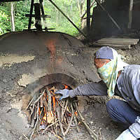 ●炭焼き窯 時ノ寿の森の間伐材からの炭づくり。かつての集落の大切な収入源であった炭を、1kg800円から時ノ寿の入り口の無人販売所にて販売中。