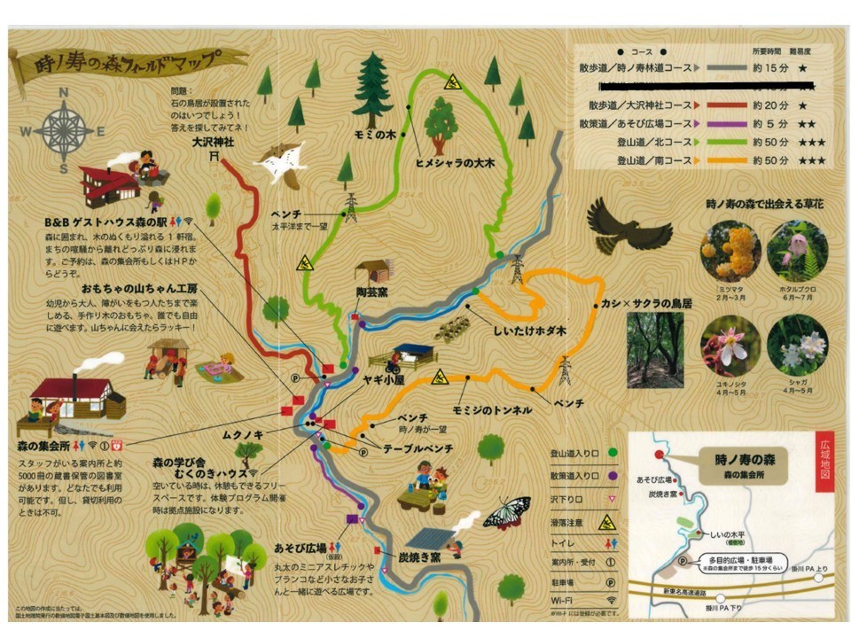 ●多目的広場 時ノ寿學校やイベントの際の駐車場など様々な用途で使用する場所。遊びに来るときはここに駐車してね。森の集会所まではゆっくり歩いて15分。トイレあり。